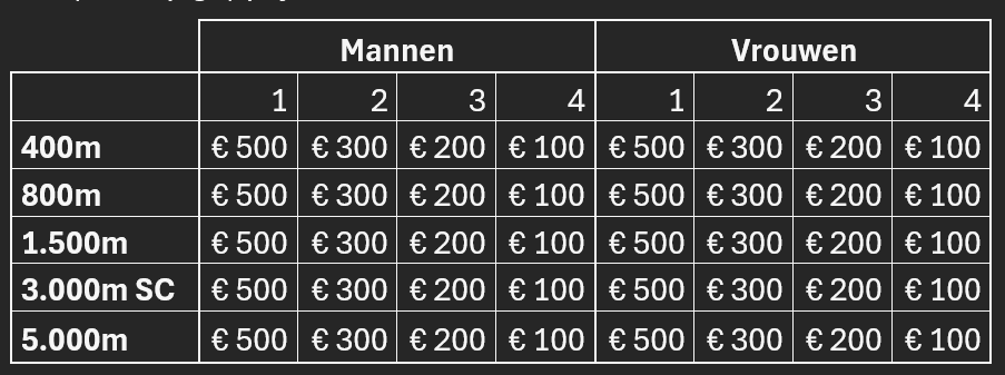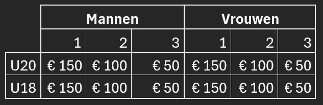 We gaan onze slogan “We support young talent” dit jaar tot uitdrukking brengen door prijzen beschikbaar te stellen voor de categorieën U10, U12, U14, U16, U18 en U20. Voor U18 en U20 zijn dat geldprijzen voor de beste 3 prestaties per leeftijdscategorie. We hanteren daarbij de World Athletics Hongaarse puntentelling, zodat de resultaten van de verschillende afstanden vergelijkbaar zijn. Deze prijzen zijn: